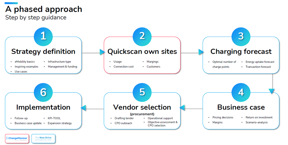 But how should you approach this investment? How do you determine the potential of your location? What type of charging infrastructure is best? And which Charging Point Operator should you partner with to ensure a hassle-free experience and maximum returns? These are questions that require some research to answer. The New Drive and RetailSonar are here to assist you in this journey. Through the approach outlined below, we can help you make strategic decisions, forecasts, and business cases and provide support up to and including the implementation. Thanks to RetailSonar's expertise, we perform a quick scan of your locations and highlight their potential. The New Drive then builds on this information and turns it into something feasible and applicable.